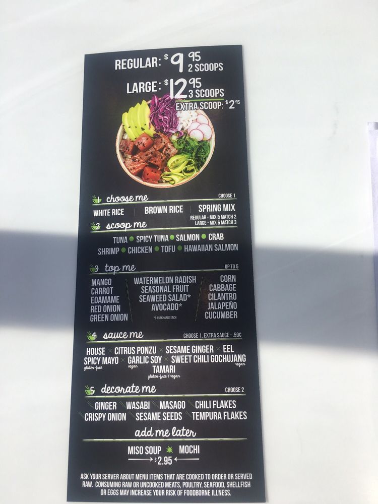“ Great service! Easy menu to follow and unique take on sushi! We got half white/brown rice! I had the California bowl...tasty and delicious. Great price for the great portion. ”